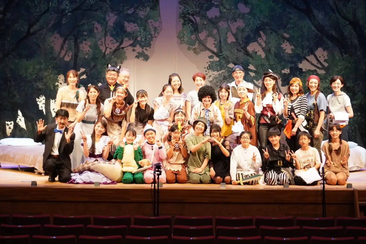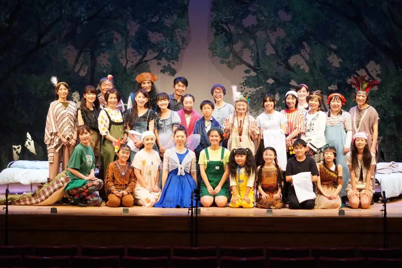 写真は「さらっていってよピーターパン」のメアリー組・ジョージ組とパフォーマンスステージの集合写真です。