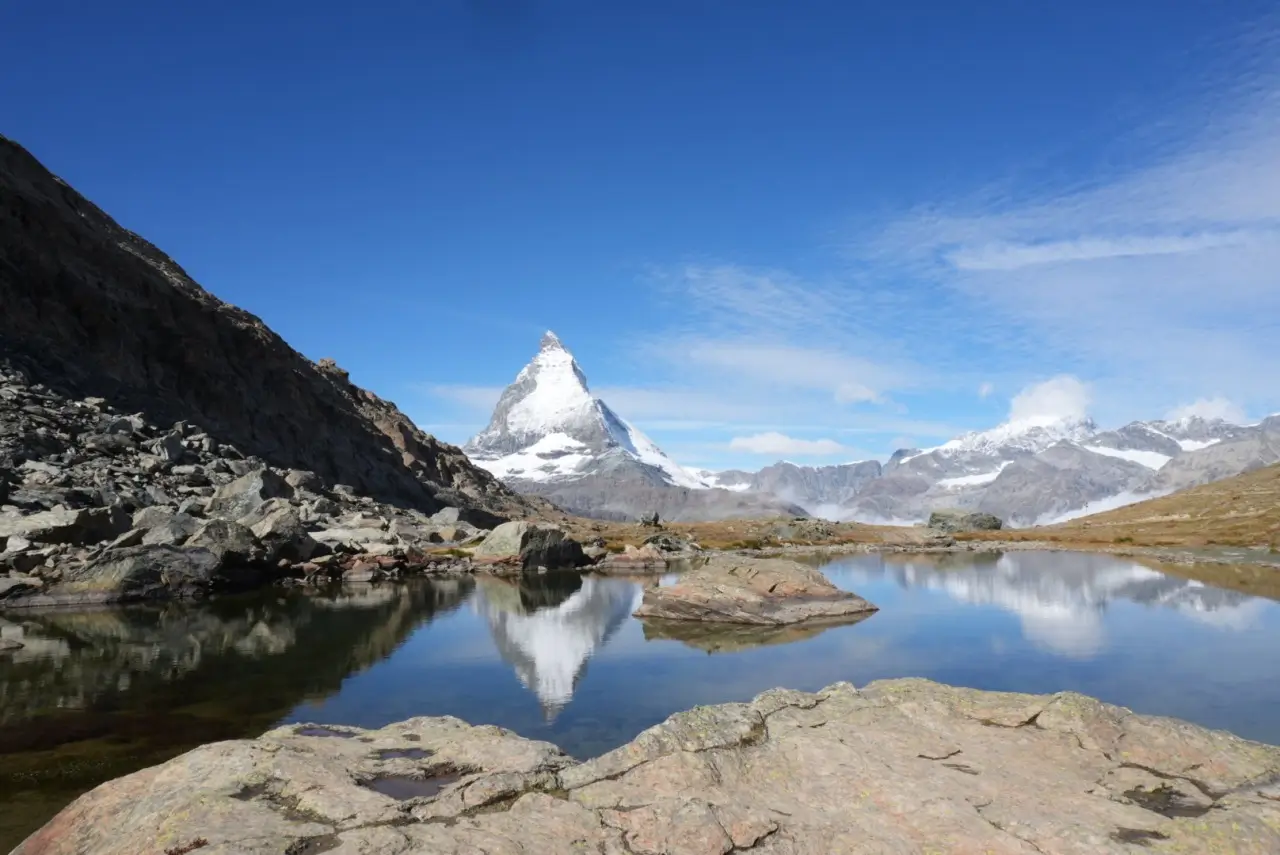 (スイスの名峰マッターホルン。幸運なことに快晴で、綺麗に湖面に写った姿がみられました)