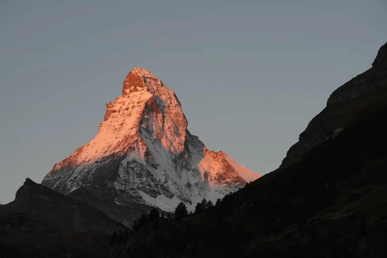 (こちらもお天気に恵まれ、朝焼けで赤くなっていくマッターホルンが見られました)