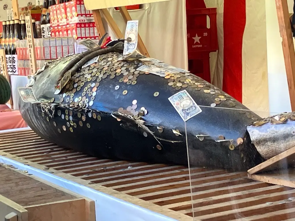 なんと!拝殿に大きなマグロが横たわっており、そこにお金が貼り付いているではないですか!