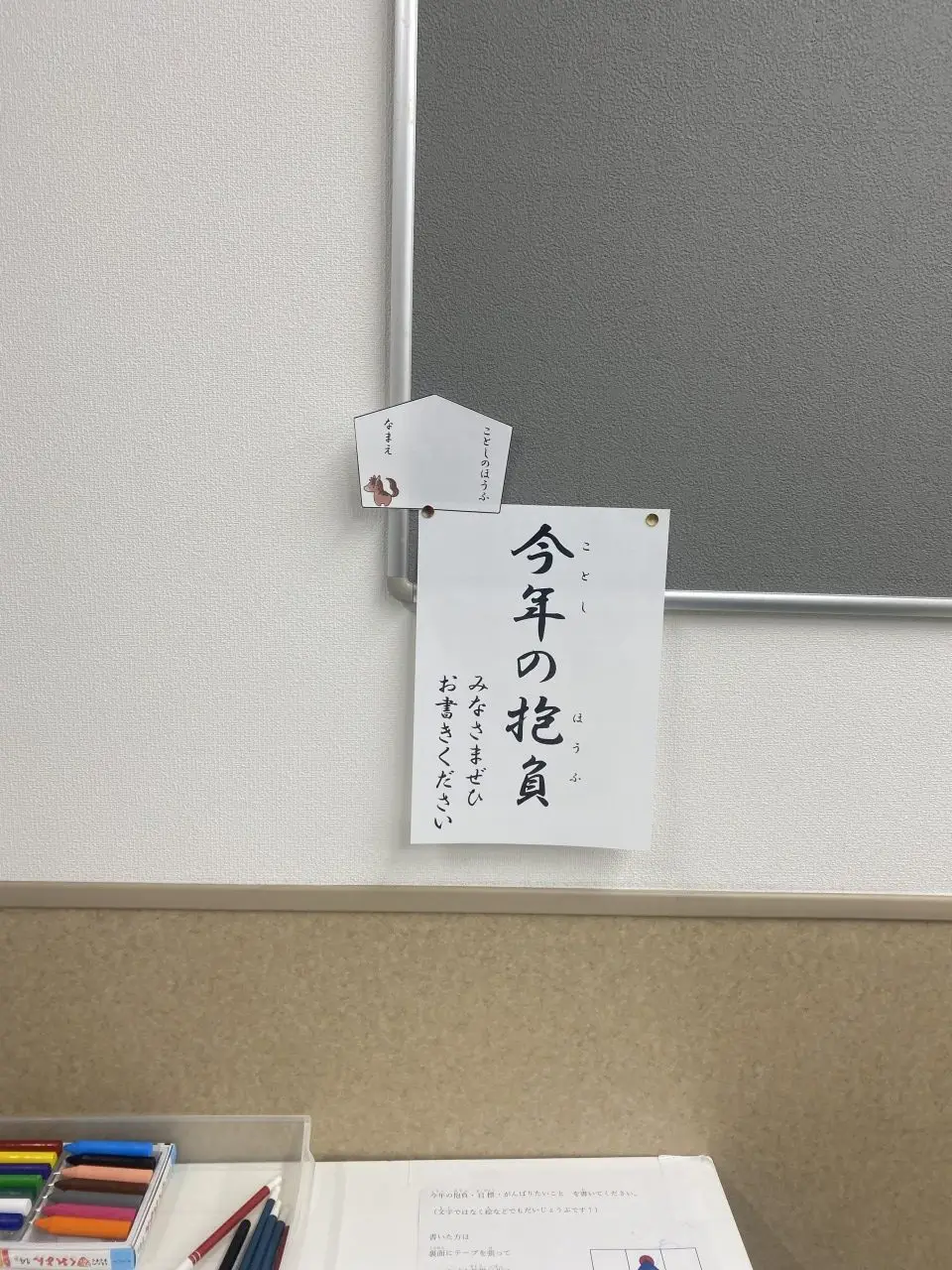 ベビーからシニア、職員までたくさんの方に今年の抱負を書いていただこうと入り口横に紙とペンを設置してみました。