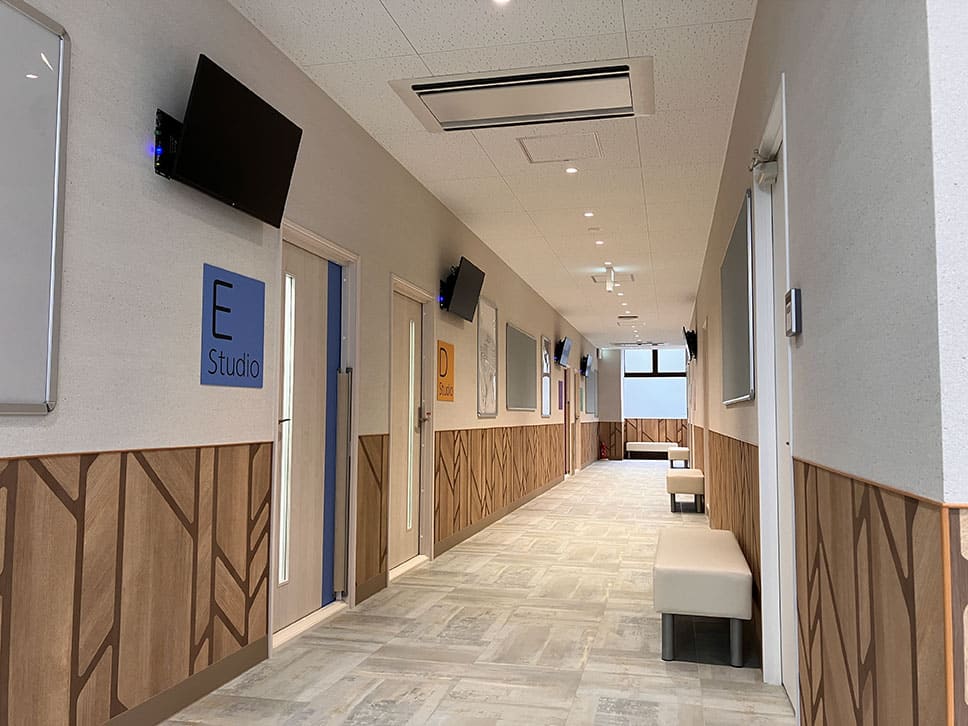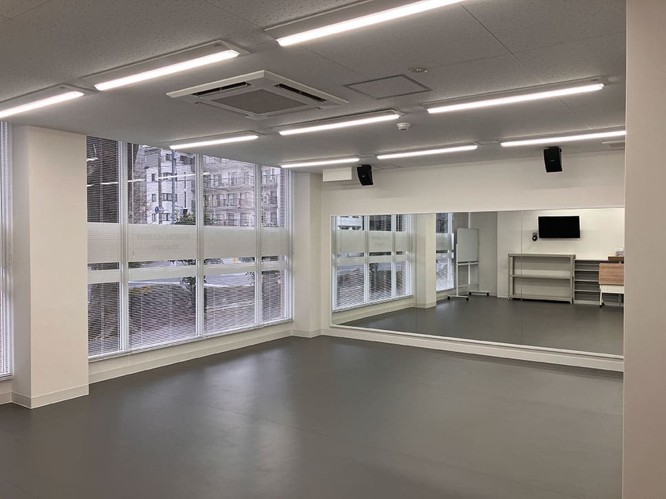 校内は広々としたフロアに5つのスタジオのほか防音室を完備。